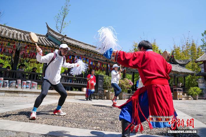 图为乘客取纳西族小伙互动,进修保守舞步。中新社记者 刘冉阳 摄